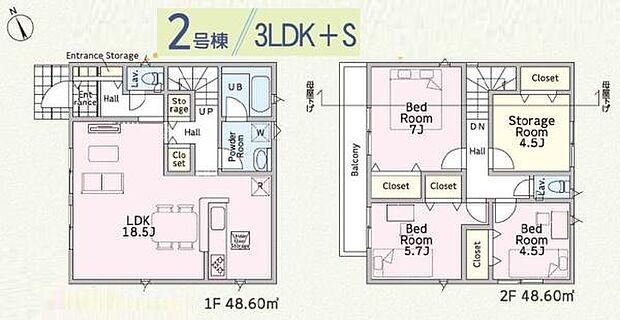 間取り内訳:リビングダイニングキッチン 18.5帖(1階)・洋室 7帖(2階)・洋室 5.7帖(2階)・洋室 4.5帖(2階)・収納 4.5帖(2階)