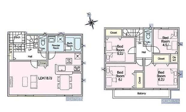 | 間取り | 4LDK 間取り内訳:リビングダイニングキッチン 18.7帖(1階)・洋室 6.2帖(2階)・洋室 6帖(2階)・洋室 5.2帖(2階)・洋室 4.5帖(2階) |