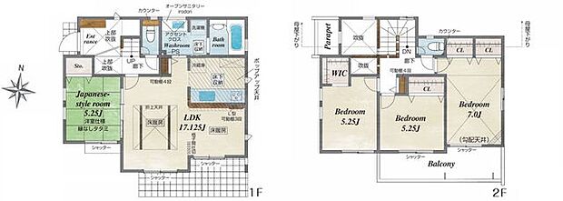 | 間取り | 4LDK 間取り内訳:リビングダイニングキッチン 17.1帖(1階)・洋室 7帖(2階)・洋室 5.2帖(2階)・洋室 5.2帖(2階)・和室 5.2畳(1階) |