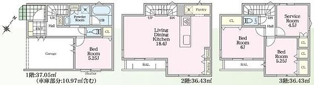 | 間取り | 3SLDK 間取り内訳:洋室 5.2帖(1階)・リビングダイニングキッチン 18.4帖(2階)・洋室 6帖(3階)・洋室 5.2帖(3階)・収納 4.5帖(3階) |