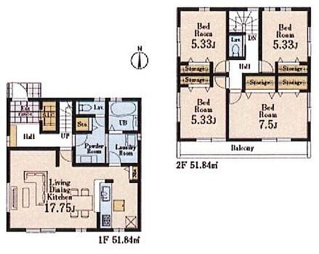 間取り内訳:リビングダイニングキッチン 17.7帖(1階)・洋室 5.3帖(2階)・洋室 5.3帖(2階)・洋室 5.3帖(2階)・洋室 7.5帖(2階)