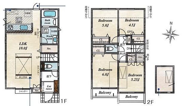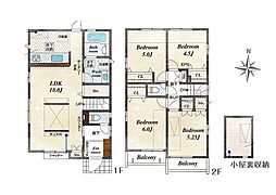 | 間取り | 4LDK 間取り内訳:リビングダイニングキッチン 18帖(1階)・洋室 5帖(2階)・洋室 4.5帖(2階)・洋室 6帖(2階)・洋室 5.2帖(2階) |