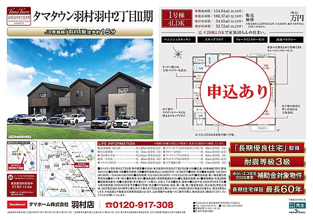 JR青梅線【羽村】駅まで約1.200m(徒歩約15分) 閑静な住宅街です。 広々20帖LDK、開放感溢れるペニンシュラキッチン、踊り場つきのスキップフロアなどなど、家族団らんのご生活が手に入ります。 長期優良住宅取得の高性能住宅。耐震等級最高等級3取得。長期住宅保証の最長60年保証。