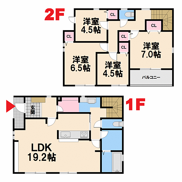 | 間取り | 4LDK 間取り内訳:リビングダイニングキッチン 19.2帖(1階)・洋室 7帖(2階)・洋室 6.5帖(2階)・洋室 4.5帖(2階)x2 |