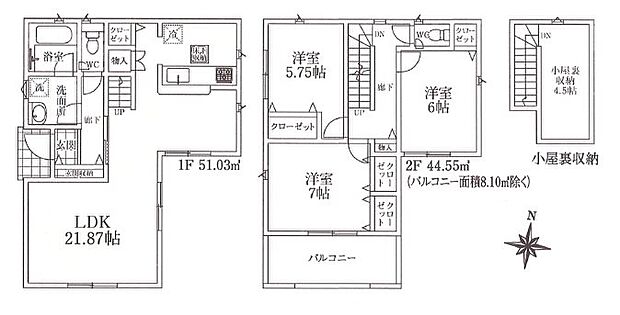 間取り内訳:洋室 7帖(2階)・洋室 6帖(2階)・洋室 5.7帖(2階)・リビングダイニングキッチン 21.8帖(1階)