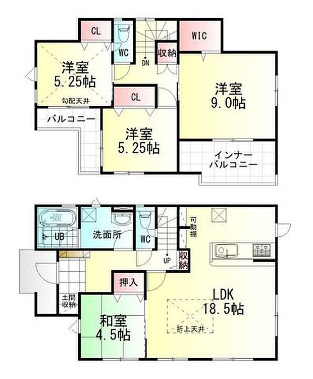 ■折上天井採用で開放的な18帖以上のLDK■WICや土間収納、各室収納付き!■バルコニー2つ有り■全室2面採光につき日当たり良好!