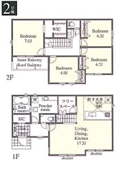 | 間取り | 4LDK(キッチン横にパントリーがあります。) 間取り内訳:リビングダイニングキッチン 17.5帖(1階)・洋室 7帖(2階)・洋室 4.9帖(2階)・洋室 4.7帖(2階)・洋室 4.5帖(2階) |