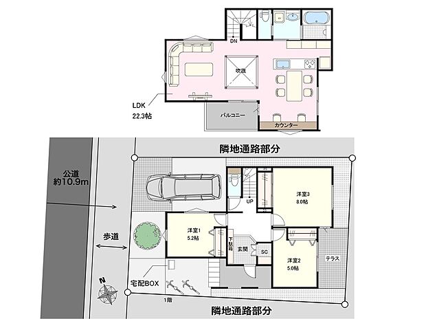 • 「建築条件付き土地」の「建物プラン例」は、土地購入者の設計プランの一例であり、プランの採用可否は任意です。