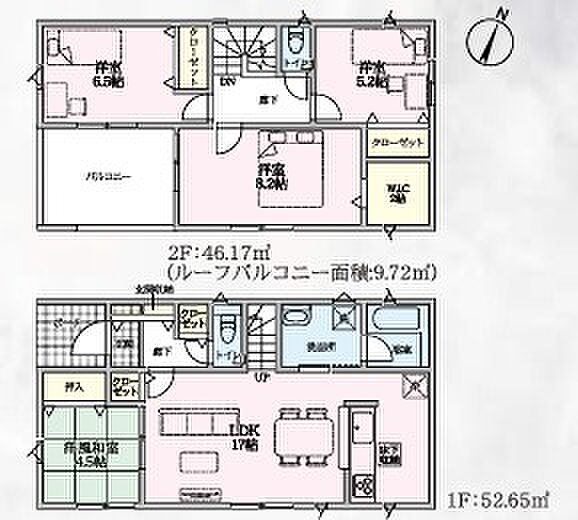 | 間取り | 4LDK 間取り内訳:リビングダイニングキッチン 17帖(1階)・和室 4.5畳(1階)・洋室 8.2帖(2階)・洋室 6.5帖(2階)・洋室 5.2帖(2階) |
