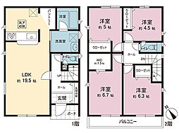 | 間取り | 3SLDK 間取り内訳:リビングダイニングキッチン 17.3帖(1階)・収納 6.3帖(1階)・洋室 6.9帖(2階)・洋室 5.6帖(2階)・洋室 5.3帖(2階) |