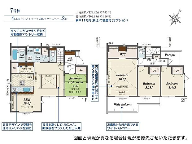 | 間取り | 4LDK 間取り内訳:リビングダイニングキッチン 19帖(1階)・和室 4.5畳(1階)・洋室 10帖(2階)・洋室 5.4帖(2階)・洋室 5.2帖(2階) |