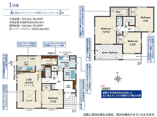 土地面積 172.33m2(約52.12坪)~195.44m2(約59.12坪)