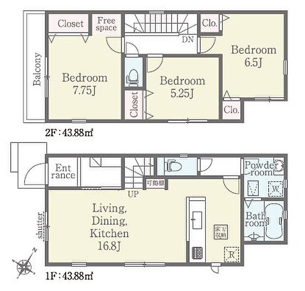 | 間取り | 3LDK 間取り内訳:洋室 7.7帖(2階)・洋室 6.5帖(2階)・洋室 5.2帖(2階)・リビングダイニングキッチン 16.8帖(1階) |