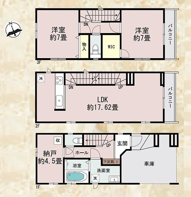 | 間取り | 2SLDK 間取り内訳:収納 4.5帖(1階)・リビングダイニングキッチン 17.6帖(2階)・洋室 7帖(3階)・洋室 7帖(3階) |