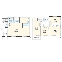 | 間取り | 4LDK 間取り内訳:リビングダイニングキッチン 21.9帖(1階)・洋室 7帖(2階)・洋室 5.3帖(2階)・洋室 5.3帖(2階)・洋室 5.3帖(2階) |