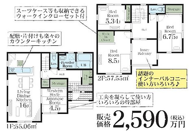 間取り内訳:リビングダイニングキッチン 16帖(1階)・和室 4.5畳(1階)・洋室 8.5帖(2階)・洋室 6.7帖(2階)・洋室 5.3帖(2階)