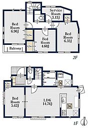 | 間取り | 4SLDK 間取り内訳:リビングダイニングキッチン 14.7帖(1階)・洋室 5.6帖(1階)・洋室 6.9帖(2階)・洋室 6.3帖(2階)・洋室 4.6帖(2階)・収納 3.1帖(2階) |