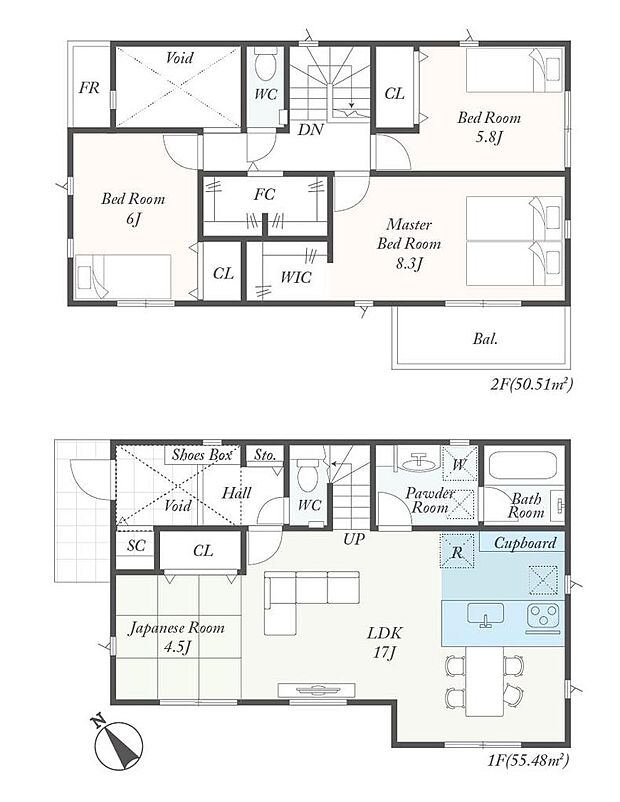 間取り内訳:リビングダイニングキッチン 17帖(1階)・和室 4.5畳(1階)・洋室 8.3帖(2階)・洋室 6帖(2階)・洋室 5.8帖(2階)