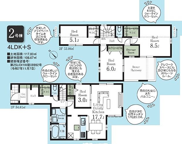 | 間取り | 4SLDK 間取り内訳:リビングダイニングキッチン 17.7帖(1階)・洋室 3帖(1階)・洋室 5.1帖(2階)・洋室 6帖(2階)・洋室 8.5帖(2階)・収納(2階) |