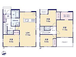 | 間取り | 4SLDK 間取り内訳:リビングダイニングキッチン 17帖(1階)・洋室 4.5帖(1階)・洋室 11.7帖(2階)・洋室 5.2帖(2階)・洋室 5.2帖(2階) |