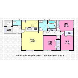 | 間取り | 3LDK 間取り内訳:洋室 5.7帖(1階)・洋室 5.7帖(1階)・洋室 4.5帖(1階)・リビングダイニングキッチン 16.2帖(1階) |