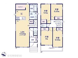 | 間取り | 3LDK 間取り内訳:リビングダイニングキッチン 11.7帖(2階)・洋室 5.7帖(1階)・洋室 5.2帖(1階)・洋室 5帖(2階) |
