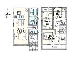 | 間取り | 3LDK 間取り内訳:リビングダイニングキッチン 14.8帖(1階)・洋室 6.5帖(2階)・洋室 5帖(2階)・洋室 4.5帖(2階) |