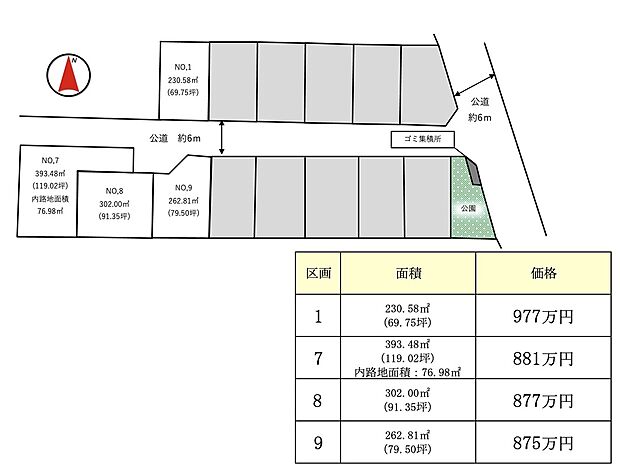 | 土地面積 | 230.58m2(69.75坪)~393.48m2(119.02坪)※No.7 内路地面積:76.98m2 | ||