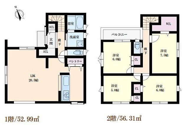 | 間取り | 4LDK 間取り内訳:リビングダイニングキッチン 20.3帖(1階)・洋室 6帖(2階)x2・洋室 5帖(2階)・洋室 7.5帖(2階) |