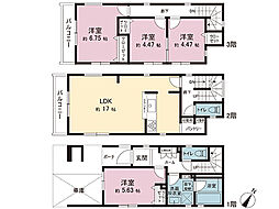間取り内訳:洋室 5.6帖(1階)・リビングダイニングキッチン 17帖(2階)・洋室 6.7帖(3階)・洋室 4.4帖(3階)・洋室 4.4帖(3階)