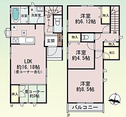 | 間取り | 4LDK 間取り内訳:洋室 4.5帖(1階)・リビングダイニングキッチン 16.5帖(1階)・洋室 5帖(2階)x2・洋室 7.5帖(2階) |
