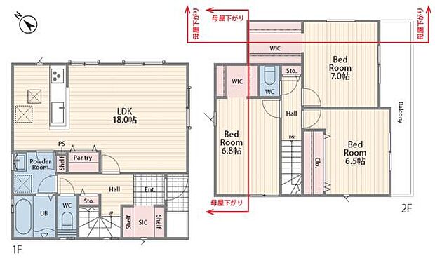 | 間取り | 3LDK 間取り内訳:リビングダイニングキッチン 18帖(1階)・洋室 7帖(2階)・洋室 6.8帖(2階)・洋室 6.5帖(2階) |