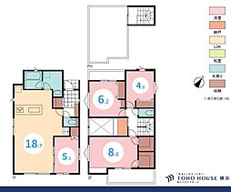 | 間取り | 4LDK 間取り内訳:リビングダイニングキッチン 18.7帖(1階)・洋室 5.1帖(1階)・洋室 8.6帖(2階)・洋室 6.2帖(2階)・洋室 4.8帖(2階) |