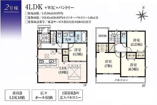 | 間取り | 4LDK 間取り内訳:リビングダイニングキッチン 18帖(1階)・洋室 4.5帖(1階)・洋室 7帖(2階)・洋室 6.5帖(2階)・洋室 5.2帖(2階) |