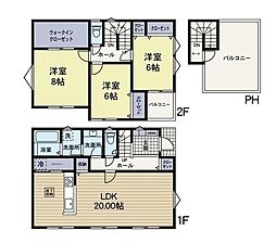 | 間取り | 3LDK 間取り内訳:リビングダイニングキッチン 20帖(1階)・洋室 8帖(2階)・洋室 6帖(2階)x2 |
