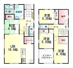 | 間取り | 3LDK 間取り内訳:リビングダイニングキッチン 16.2帖(1階)・洋室 6帖(2階)・洋室 6帖(2階)・洋室 5.7帖(2階) |