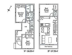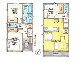 | 間取り | 2LDK(その他4.5帖は洋室仕様・各部屋収納(WIC1箇所)・リビング収納・リビング階段) 間取り内訳:リビングダイニングキッチン 13.5帖(1階)・洋室 7帖(2階)・洋室 4.5帖(2階)・その他 4.5帖(2階) |