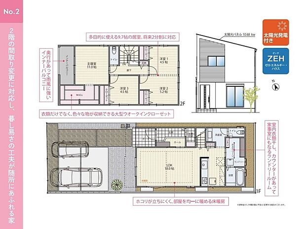 ●衣丘小学校まで徒歩5分、朝日丘中学校まで徒歩15分と距離が近く、お子様の通学も安心な立地 ●愛知環状鉄道線「新豊田」駅まで徒歩16分!駅に近く通勤・通学にも利用できて便利です ●18帖のゆとりあるリビング空間で家族団らんの時間を過ごすことができます ●床暖房付き ホコリが立ちにくく、お部屋全体を均一に暖めてくれます ●土間収納やFCL、パントリー、リネン庫、WICLなど各所に収納が充実した間取りプラン ●家族構成の変化や使い方に合わせて将来的に2部屋に分割することが可能な可変型間取り