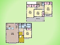 | 間取り | 3SLDK 間取り内訳:リビングダイニングキッチン 20.8帖(1階)・洋室 9帖(2階)・洋室 5.2帖(2階)x2・収納 5帖(2階) |