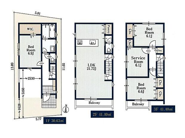 | 間取り | 3SLDK 間取り内訳:洋室 6.9帖(1階)・リビングダイニングキッチン 21.7帖(2階)・リビングダイニングキッチン 17.1帖(2階)・洋室 6.6帖(3階)・洋室 6.1帖(3階)・収納 6.1帖(3階) |