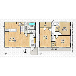 | 間取り | 2SLDK 間取り内訳:リビングダイニングキッチン 17.6帖(1階)・洋室 7.5帖(2階)・洋室 6帖(2階)・収納 5.2帖(2階) |