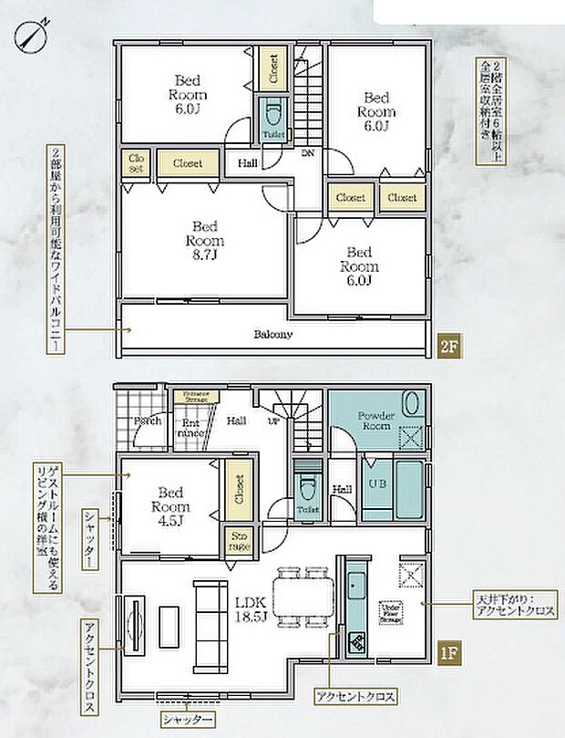 間取り内訳:リビングダイニングキッチン 18.5帖(1階)・洋室 4.5帖(1階)・洋室 8.7帖(2階)・洋室 6帖(2階)x3