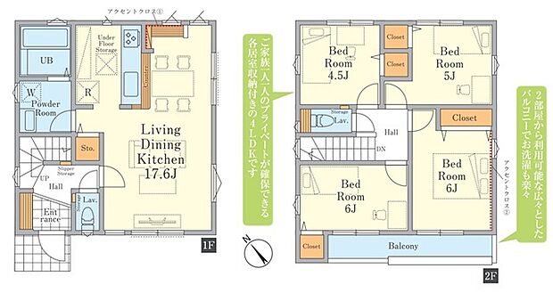 駅徒歩6分。南西道路面。LDK17.6帖。水廻り集中。2階4居室。駐車並列2台可(車種による)。コンビニ・ドラッグストア徒歩4分。