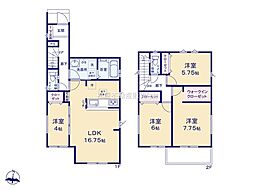 | 間取り | 3SLDK 間取り内訳:リビングダイニングキッチン 16帖(1階)・洋室 5帖(1階)・洋室 7.5帖(2階)・洋室 5.2帖(2階)・収納 6帖(2階)・洋室 5.1帖(2階) |