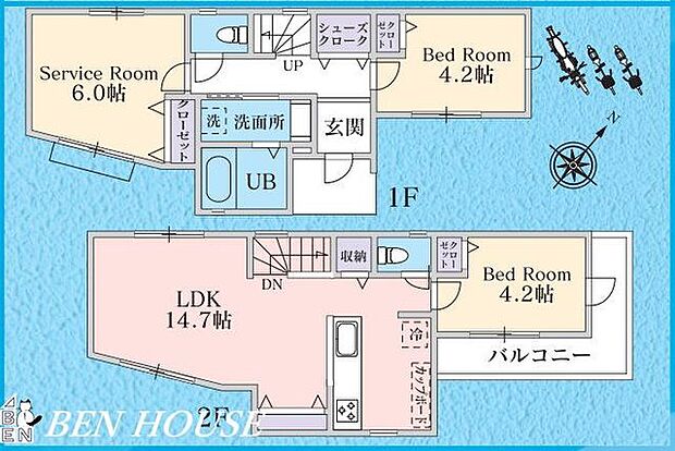 間取り内訳:リビングダイニングキッチン 14.7帖(2階)・収納 6帖(1階)・洋室 4.2帖(2階)・洋室 4.2帖(1階)
