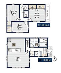 | 間取り | 2SLDK 間取り内訳:リビングダイニングキッチン 15.1帖(1階)・洋室 6.1帖(2階)・洋室 5.1帖(2階)・収納 6.1帖(2階) |