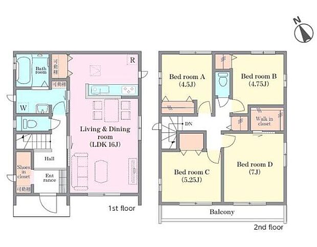 | 間取り | 4LDK 間取り内訳:リビングダイニングキッチン 16帖(1階)・洋室 7帖(2階)・洋室 5.2帖(2階)・洋室 4.7帖(2階)・洋室 4.5帖(2階) |