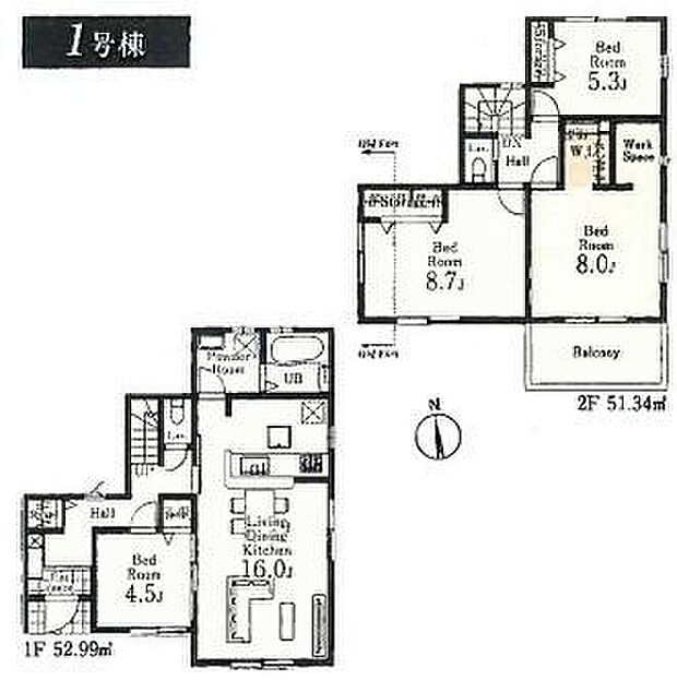 | 間取り | 4LDK 間取り内訳:リビングダイニングキッチン 16帖(1階)・洋室 4.5帖(1階)・洋室 8.7帖(2階)・洋室 8帖(2階)・洋室 5.3帖(2階) |