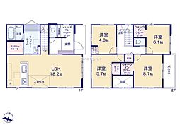 | 間取り | 4LDK 間取り内訳:リビングダイニングキッチン 18.2帖(1階)・洋室 8.1帖(2階)・洋室 6.1帖(2階)・洋室 5.7帖(2階)・洋室 4.8帖(2階) |