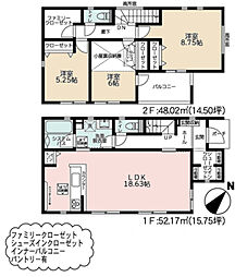 | 間取り | 4LDK 間取り内訳:リビングダイニングキッチン 20帖(1階)・洋室 5帖(2階)・洋室 5帖(2階)・洋室 5.2帖(2階)・洋室 7.5帖(2階) |
